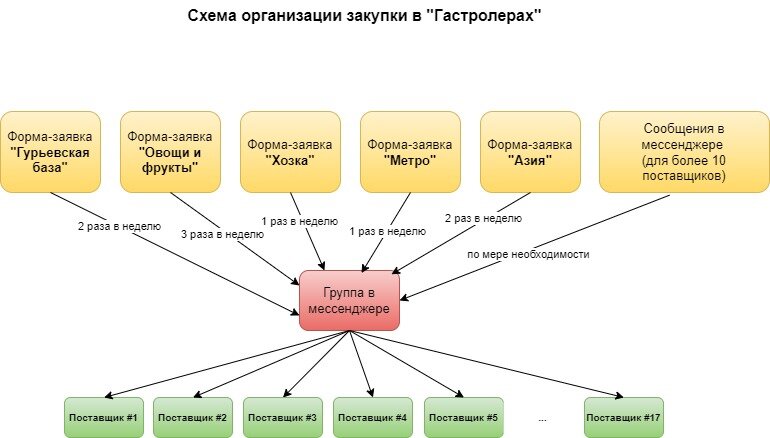 В одном из наших предыдущих постов мы с вами обсудили различные способы организации закупок в ресторанах, подробно рассмотрев их плюсы и минусы. В "Гастролерах" мы решили выбрать самый сложный из них, когда сырье поставляется несколькими разными поставщиками, а не одним. Да, это вызвало определенные организационные сложности, но мы успешно справились с этим вызовом. Наша система работает как часы, эффективно и позволяет нам контролировать цены на продукты, следить за их качеством и своевременностью поставки. Благодаря такому подходу, уже более четырех лет мы работаем на этой сложной, но очень эффективной системе.