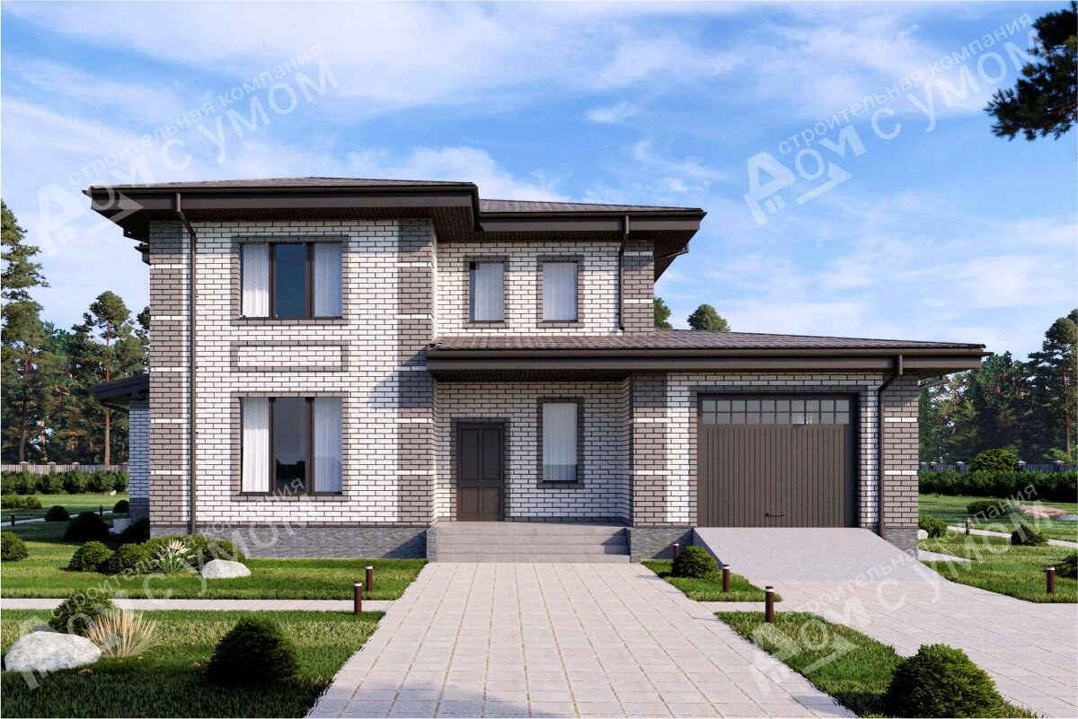 Это современный двухэтажный дом для семьи из 4-ех человек. Проект двухэтажный, но площадь первого этажа значительно больше второго. Из-за этого геометрия дома выглядит интереснее и сложнее. Общая площадь: 215 кв.м