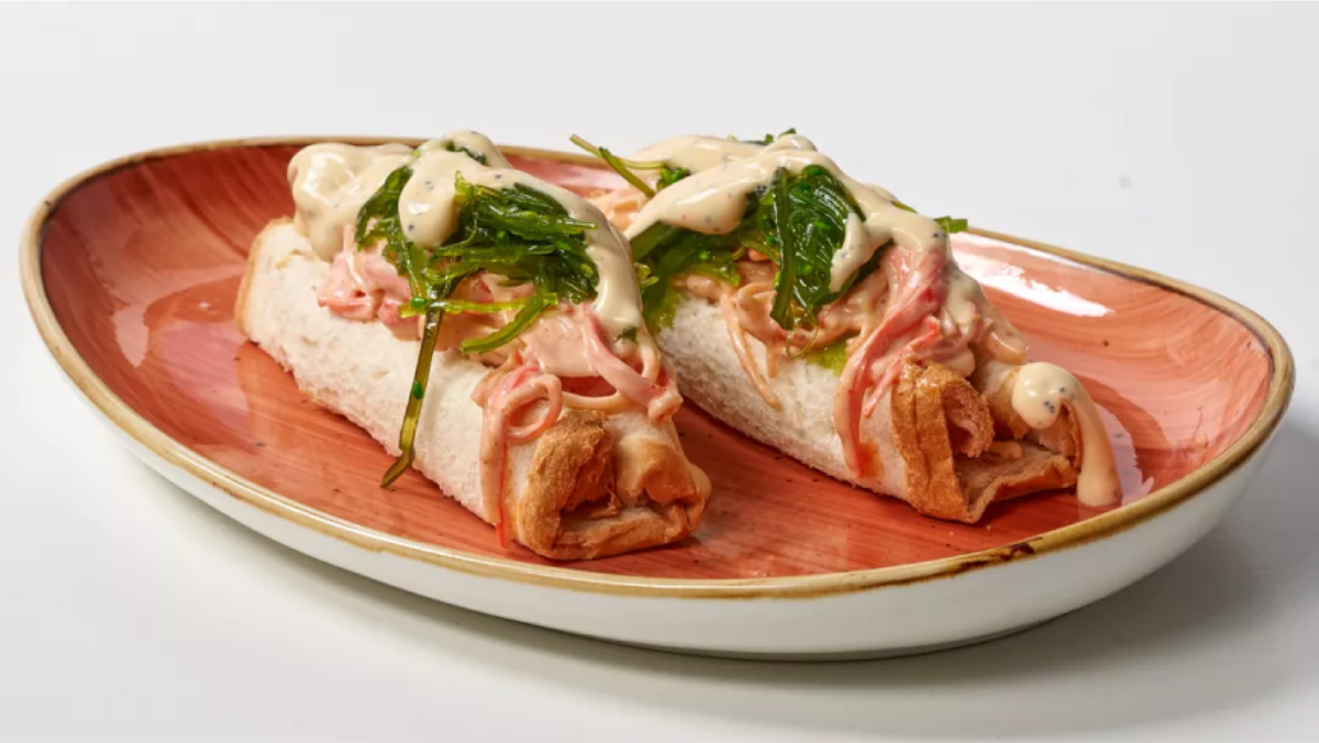 Крабовые палочки отлично сочетаются с различными соусами и добавками. Помимо японского майонеза, для яркости вкуса рекомендуем добавить сладкий соус чили и соус шрирача. А для подачи еще дополнительно полейте сверху сэндвич ореховым соусом. Можете заменить эти соусы нашими аналогами, но лучше постараться найти оригинальные — вкус получится отменный. Можете добавить в начинку авокадо, сельдерей, помидоры или огурцы. А можете сделать, как мы, и ограничиться только салатом из водорослей чука.