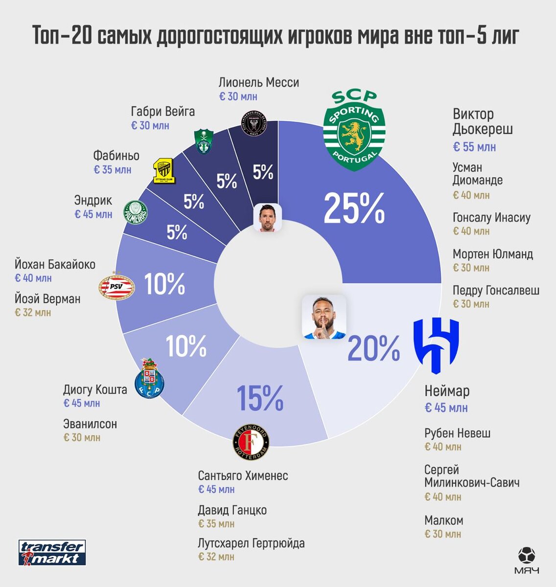 В мире футбола существует не только топ-5 лиг. За их пределами есть клубы, которые могут похвастаться звёздными составами и впечатляющими трансферными суммами. В этой статье мы рассмотрим топ-20 самых дорогих игроков, выступающих вне пяти сильнейших чемпионатов Европы.