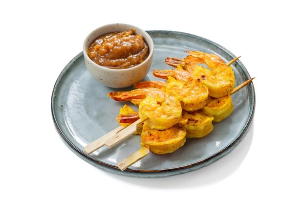ИНСТРУКЦИЯ ПРИГОТОВЛЕНИЯ 1.Подготовить все ингредиенты. Шпажки предварительно замочить в воде, чтобы они не сгорели во время жарки. 2.Креветки очистить от панцирей, оставив у них только хвостики для красоты. Ножом надрезать спинки и удалить пищеводы. 3.Переложить креветки в миску, добавить к ним зиру, кориандр, куркуму и 2 пропущенных через пресс зубчика чеснока. 4.Залить креветки кокосовым молоком и половиной сока лайма. Хорошо перемешать и оставить мариноваться на час. 5.Для соуса смешать арахисовую пасту, соевый соус, шрирачу, уксус, сахар и оставшийся сок лайма. 6.Добавить выдавленный через пресс оставшийся чеснок и натертый на мелкой терке имби