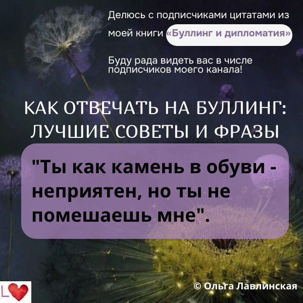 Делюсь с подписчиками цитатами из моей книги «Буллинг и дипломатия». Буду рада видеть вас в числе подписчиков моего канала! Когда сталкиваешься с буллингом, важно уметь эффективно отвечать на агрессию. Некоторые полезные фразы для ответа на буллинг могут быть: "Ты как камень в обуви - неприятен, но ты не помешаешь мне".