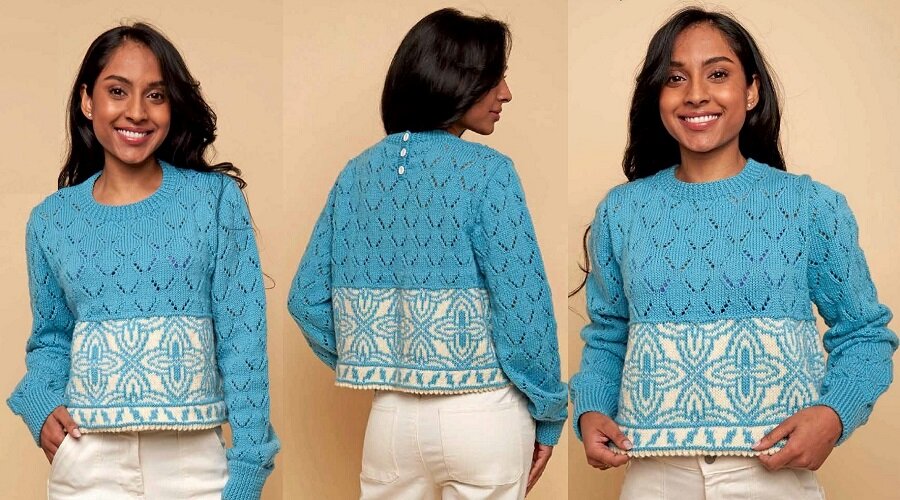 Удачно подружились жаккард и ажур в одном изделии. Пуловер голубого цвета с белым всегда выигрышная комбинация. Низ пуловера оформлен плотной каймой из зубчиков, для свободного края и подчеркивания узора на жаккарде. Планка с пуговицами расположена на спинке изделия. В таблице к схеме выкройки даны расчеты для 9 размеров. Пряжа рекомендована плотностью 50г \ 100м. Спицы для вязания ажурного узора 4мм, жаккарда и резинок 3,5мм. Схемы узоров смотрите ниже. Разработала, связала и поделилась фото и расчетами талантливый мастер Anni в журнале по вязанию Knit Now №168 2024.