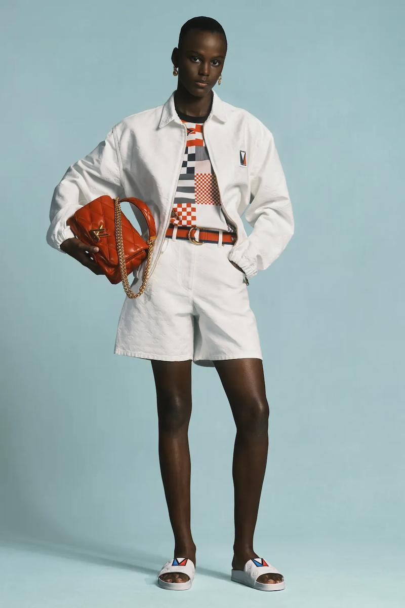 С наступлением темноты роскошные мероприятия мечты на берегу моря требуют изысканной атмосферы. Для женщин тема «Элегантный летний вечер» предлагает идеальные решения для самых торжественных случаев: длинные платья-колонны из белого или черного крепа с кожаными или металлическими вставками и аксессуарами, такими как мини-сумки-капюшоны. Для мужчин элегантный двубортный пиджак, отделанный золотыми пуговицами LV и вставками в клетку на плечах, сочетается с фирменной рубашкой с длинными рукавами, расклешенными брюками и лоферами.