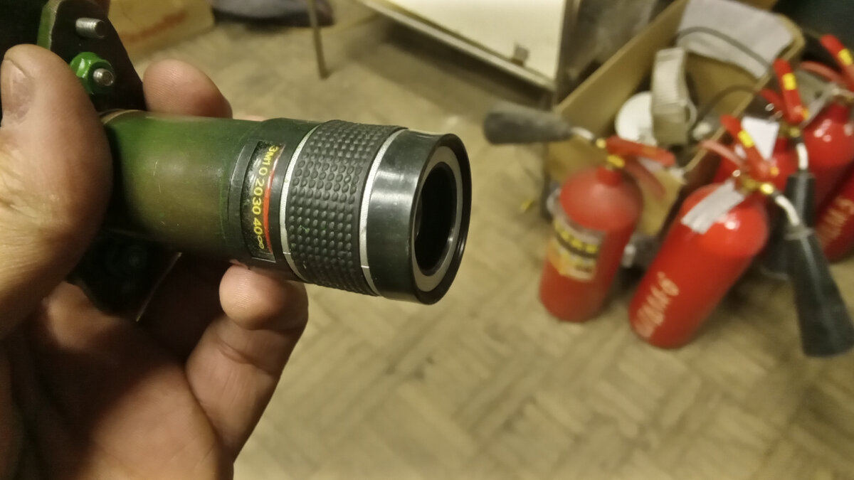 Помните статью о видеонаблюдении на Андроиде? Как показала практика, широкоугольный объектив смартфона для этого подходит мало – светофор толком не видно, поэтому я заказал объектив для смартфона. Пришёл 20-кратный, хотя я заказывал 12-кратный, но ничего – так даже лучше: Как видим по шкале и поворотному кольцу, объектив имеет свою ручную фокусировку – от этого никуда не деться. Судя по коробке, существует ещё и третий тип – 8-кратный. Честно говоря, смысла в нём не вижу – мылит здорово, проще обрезать оригинальный снимок. Для крепления к телефону в комплекте идёт прищепка, но это никуда не годится – она постоянно будет съезжать, а даже пара миллиметров перекоса дают разъехавшиеся оптические оси и пропадание картинки. Из толстого алюминиевого листа вырезаю ушко, куда запрессовываю объектив, из тонкого – паук на калошу телефона, прикручиваю к калоше, предварительно сведя оптические оси: Винты потайные и надеваться калоше на телефон не мешают: Конечно, идеально расстояние и оси выдержать