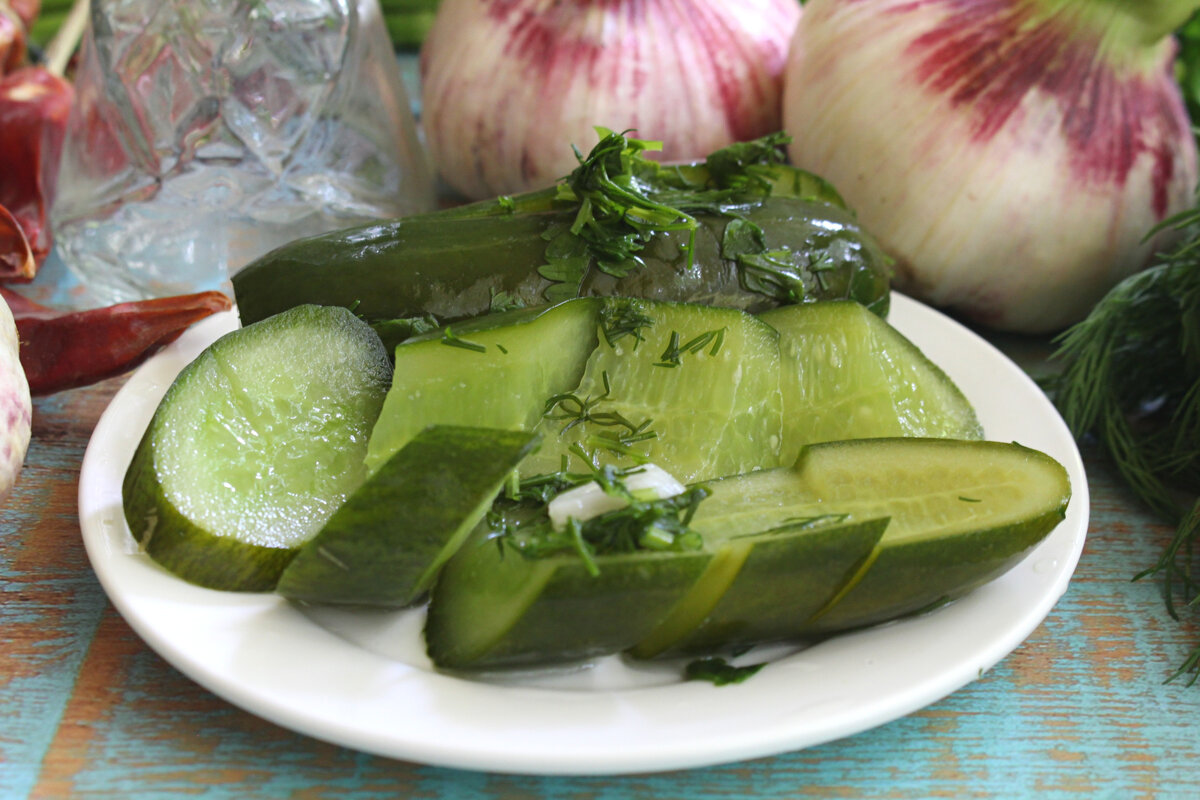 Эти огурцы готовятся не совсем привычным способом, но получаются они вкуснее, чем целые огурцы. Эти огурцы мы будем как бы фаршировать душистой начинкой из чеснока и зелени. За ночь огурцы будут готовы и вы сможете подать их к столу уже на следующий день. Огурцы получаются хрустящие, ароматные, сочные, просто сплошное удовольствие! Для приготовления желательно выбирать небольшие огурцы. Эта замечательная легкая закуска отлично заменит сытные и калорийные салаты, если вы решили от них отдохнуть. Ингредиенты: Огурцы - 1 кг. Чеснок - 4-5 зуб. Укроп - 6-7 веточек Сельдерей - 3-4 веточки Кинза - 0.5 пучка Рассол: Вода - 1 л. Соль - 1-2 ст.л. Сахар 2 ст.л. У огурцов срежем горькие "попки". А сами огурцы разрежем сверху, вдоль пополам, но не дорезая до хвостиков. Подготовим, промоем зелень, чеснок почистим. Если вы не любите кинзу, добавьте только укроп и сельдерей. Если вы используете зимний чеснок, то его можно добавить меньше. Если же у вас есть под рукой молодой чеснок, лучше готовить нач