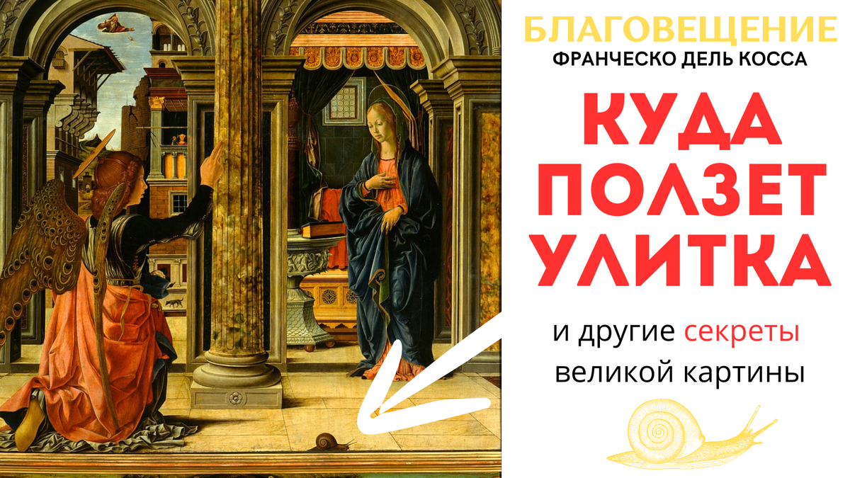 Начнем сразу с улитки. Она символизирует Христа. Как это? “Благовещение” Франческо Дель Коссы это - конец раннего Ренессанса и здесь мы видим какое-то уникально пограничное состояние между иконой и картиной, а также между Средневековьем и Ренессансом. Даже у самого Франческо всё остальное уже другое, уже совсем живопись, совсем уже Возрождение.