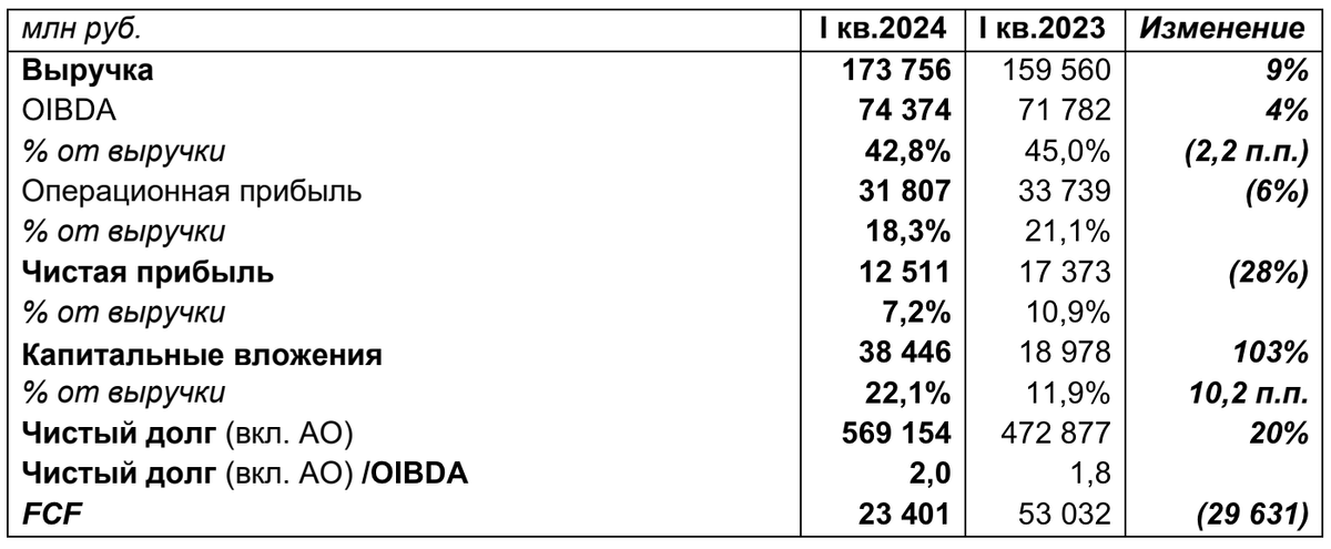 Ростелеком вчера опубликовал слабую финансовую отчётность за I кв. 2024 г. по МСФО. Кроме этого, менеджмент компании сообщил о предстоящем IPO в сфере облачных услуг и ЦОДов. Что с финансовыми результатами? Выручка компании выросла на 8,9% – до 173,8 млрд руб. Чистая прибыль Ростелекома сократилась на 28% по сравнению с аналогичным периодом прошлого года и составила 12,5 млрд руб. Свободный денежный поток упал на 56% – до 23,4 млрд руб. Сокращение прибыли обусловлено снижение операционной прибыли и ростом финансовых расходов на 59,4% год к году из-за обслуживания долга. Около половина его с плавающей ставкой. Таким образом, высокие ставки продолжат оказывать давление на прибыль Ростелекома. FCF сократился в результате двукратного роста капитальных затрат – до 38,4 млрд руб. IPO «дочки» Ростелекома Вместе с публикацией отчёта финансовый директор Ростелекома сообщил о планируемом выводе на IPO компании «РТК-ЦОД», которая работает в сфере облачных услуг и ЦОДов. Компания занимает 33% рынк
