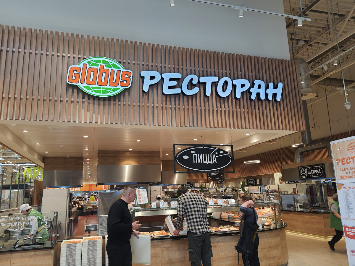 Предлагаю пройтись со мной по ресторану гипермаркета "Глобус" и посмотреть, чем тут кормят. Ну и пообедать конечно. Ресторан "Глобуса" -- это конечно же не тот ресторан с официантами,скатертями и счётом с чаевыми. Это в нашем понимании столовая, только с очень высокими стандартами по приготовлению еды, ассортименту и обслуживанию.