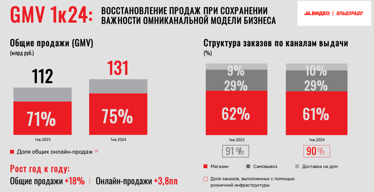 📈 Общие продажи GMV в 1 кв. 2024 г. выросли на 18% г/г до 131₽ млрд.