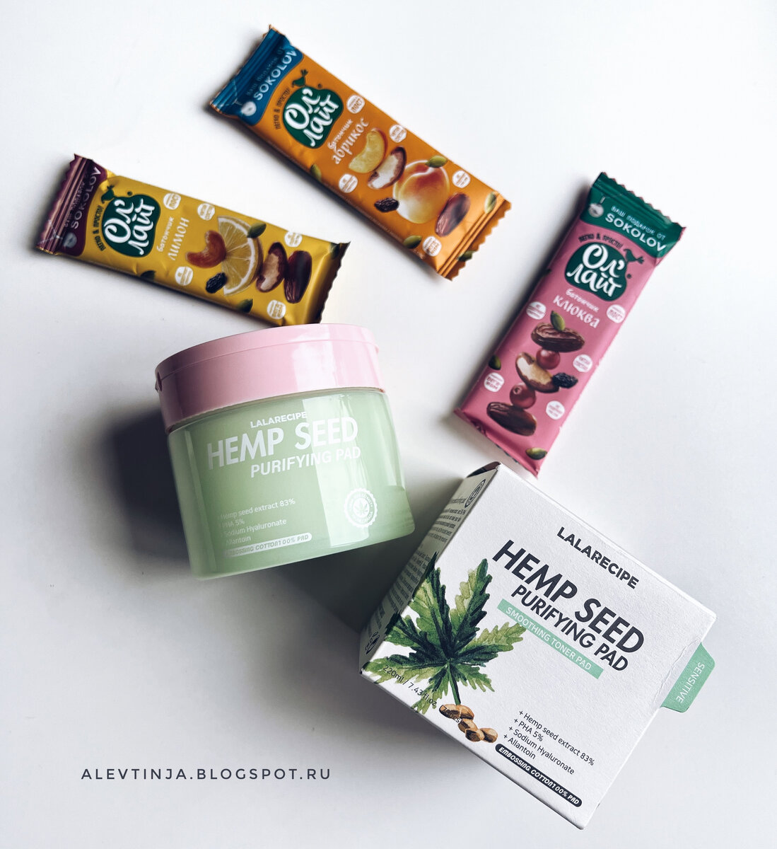 Всем привет! Совсем небольшая посылочка, которую я получила ещё в начале апреля. Батончики съедены, пэды - в активном использовании. Так что сразу поделюсь и своим мнением о полученных товарах. Итак, заказала - получила: 🍏 Диски для лица Lalarecipe Hemp seed purifying pad Роскошные диски с прекрасным составом! Пользуюсь ежедневно. Приспособила их в вечерней рутине на этапе тоника. И доочищает, и отмершие клетки удаляет. Кожа говорит "спасибо". Подробный отзыв можно прочитать ЗДЕСЬ БАТОНЧИКИ 🍏 Батончик Ол`Лайт ЛИМОННЫЙ 🍏 Батончик Ол`Лайт АБРИКОСОВЫЙ 🍏 Батончик Ол`Лайт КЛЮКВЕННЫЙ У всех батончиков превосходный состав - только сухофрукты и орешки. Никаких ароматизаторов, сахара, глютена, молока и пр. Например, ингредиенты абрикосового варианта выглядят так: финики сушеные, абрикосы сушеные, изюм, семена тыквы, семена подсолнечника, бразильский орех. Куда лучше? Примерно такие же составы и у других. Батончики небольшие, плоские. Посмотрите, какие они на разломе. Я сфотограф