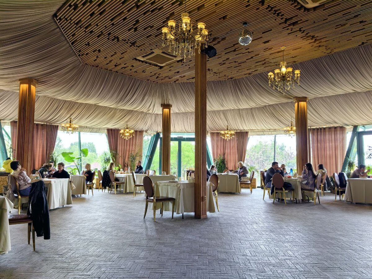 Всем привет! Три года назад уже писала о парке, и вот опять заехали с туристами с двумя целями - поесть и погулять)) Опять в мае, опять под дождем. Но парк настолько прелестный, что лично мне нравится и не на пике цветения. Ехали мы после экскурсии по Железноводску, а следующей целью был Пятигорск. Ну и решили совместить приятное с полезным. Парк находится в поселке Иноземцево по ул.Гагарина, 188. Вход на территорию стоит 100 рублей для взрослого. Мы сразу пошли греться в ресторан Терраса)) Внутри он не особо презентабельный, но много места, большое расстояние между столами, в обеденное время почти все занято. Были свидетелями, как на свободном пространстве моментально развернули три складных стола, скатертью накрыли и как будто так и было. Судя по сцене и аппаратуре, вечером тут поют и пляшут. Этого не люблю. а пообедать прекрасно - огромное меню от суши до пиццы и отличный сервис. Цены на общекурортном фоне тоже норм) После обеда (все остались довольны и втроем поели на 3 с небольши