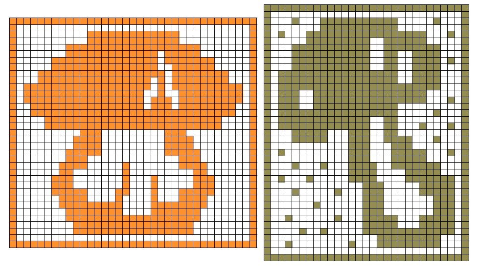 Ещё даже не наступила грибная пора, а мне почему-то захотелось составить схемы для мозаичного вязания крючком таких вот грибков: боровик и подосиновик. Схема для оранжевого грибочка (размер: 35 рядов в ширину и 35 рядов в высоту). Схема для зелёного грибочка (размер: 29 рядов в ширину и 39 рядов в высоту) Обе схемы составлены в «гобеленовой» технике мозаичного вязания крючком, только в схеме для зелёного грибочка узор фона немного разбавила одиночными такими вкраплениями (как при «вафельном вязании» только реже). Схемы при желании можно изменить по своему усмотрению (добавить или убрать элементы узора или фона). Такие схемы хорошо подойдут для вязания детских пледов, и вот, пока писала статью подумала, если ножку гриба вязать одним цветом, а шляпку - другим, интересно, как будет смотреться в вязаном виде. На этом всё, спасибо за просмотр! Всем ровных столбиков! Светлана, автор канала.