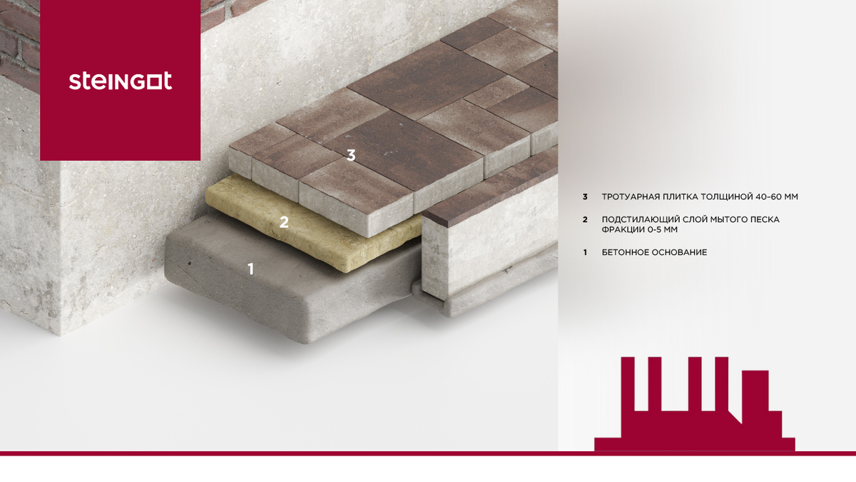 Несмотря на простоту требований, основание является инженерным сооружением и требует грамотного расчёта. Если расчётом нагрузок, определением грунтов и геодезических условий у профессионалов обычно все варианты отработаны, то с водоотведением на бетонном основании (БУ) ситуация может быть сложнее. Требования к основанию для тротуарной плитки довольно простые: оно должно быть спроектировано под конкретные условия участка (грунты, перепад высот, уровень грунтовых вод), выдерживать расчётные нагрузки и эффективно отводить воду, попадающую под плитку через швы. Если все условия позволяют сделать изначально водопроницаемое основание из щебня, геотекстиля и песка, то вопрос с водоотведением можно считать решенным. Но часто встречаются ситуации, когда плитку приходится укладывать на бетонное основание, и здесь решения по отведению воды будут разными. Рассмотрим наиболее распространенные варианты мощения с бетонными основаниями: При устройстве основания с нуля это требование соблюсти несложно.