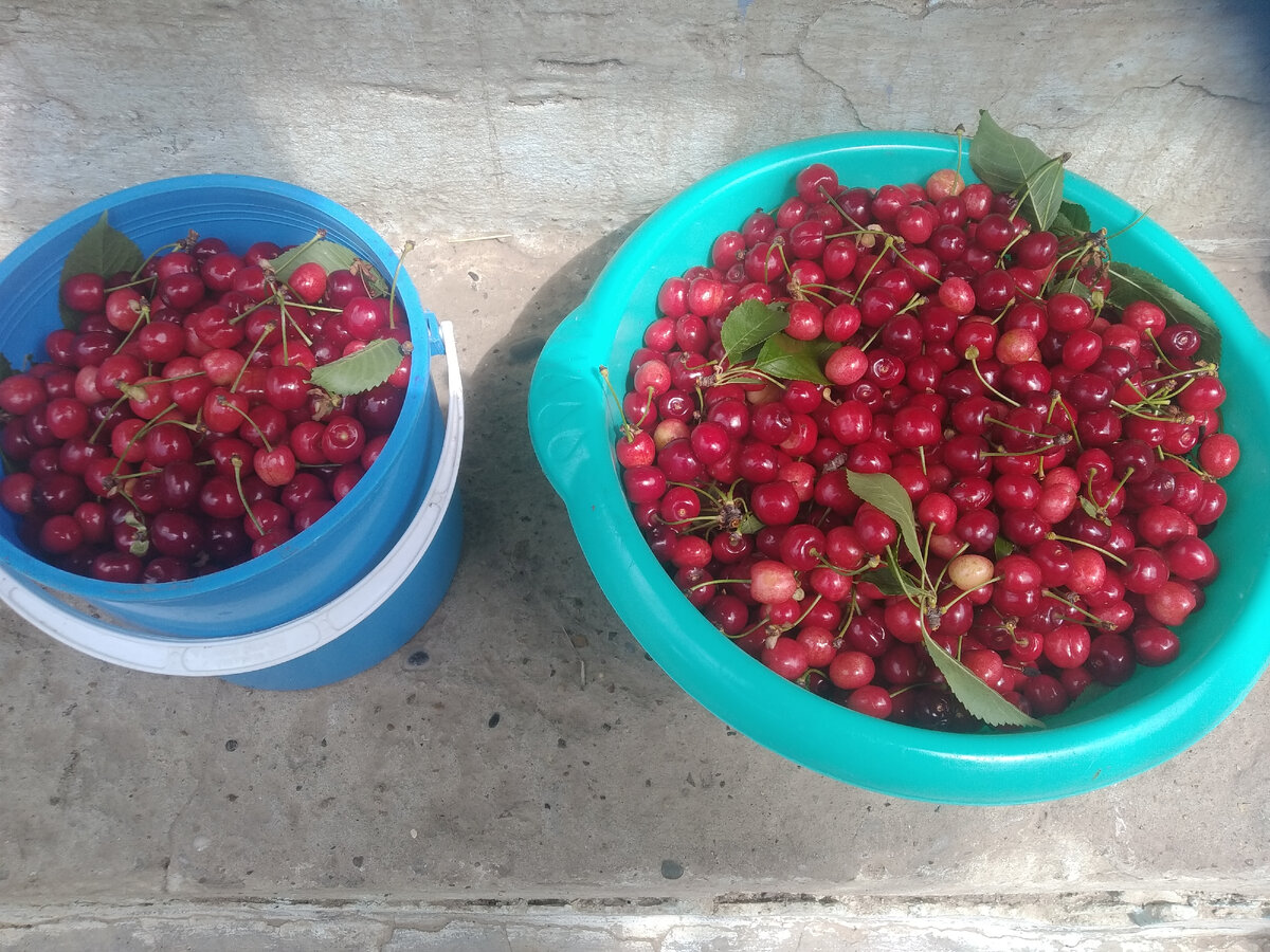 Всем привет дорогие друзья .С утра проводив дочку ,и купив продуктов и свое лекарство ,пришла домой чуть отдышалась и набрала ведра и таз пошла к соседке собирать черешню ,взяла лопату от нежелательных гостей ,и Белку кошку мою под мышку .Нашла дерево черешни полно .стала собирать кошка сидела и гуляла рядом ,насобирали мы с ней небольшой таз . Она стала мяукать ,как будто потеряла кого то.Мяукая удалилась с участка соседей и убежала в свой двор.Оставтла меня одну в чужом саду .Кошачья логика 🐈. Насобирала ещё ведро небольшое и все больше достать не могла ,наелась до отвала этой черешни ,мелкая ,но сладкая .Шла соседка по проулку и увидев меня обрадовалась ,что я уже какой то урожай собираю 17 мая .Перепутала наверно с хозяйкой сада .Ещё у меня было ведро маленькое ,но за ветками я прыгала немного достала и больше нет ,не лезть же на тонкое дерево и ветки сломать нельзя .Думаю мне хватит .Пришла домой перебрала ,помыла ,стала варенье варить ,получилось приторно сладкое ,но жидкое ,з