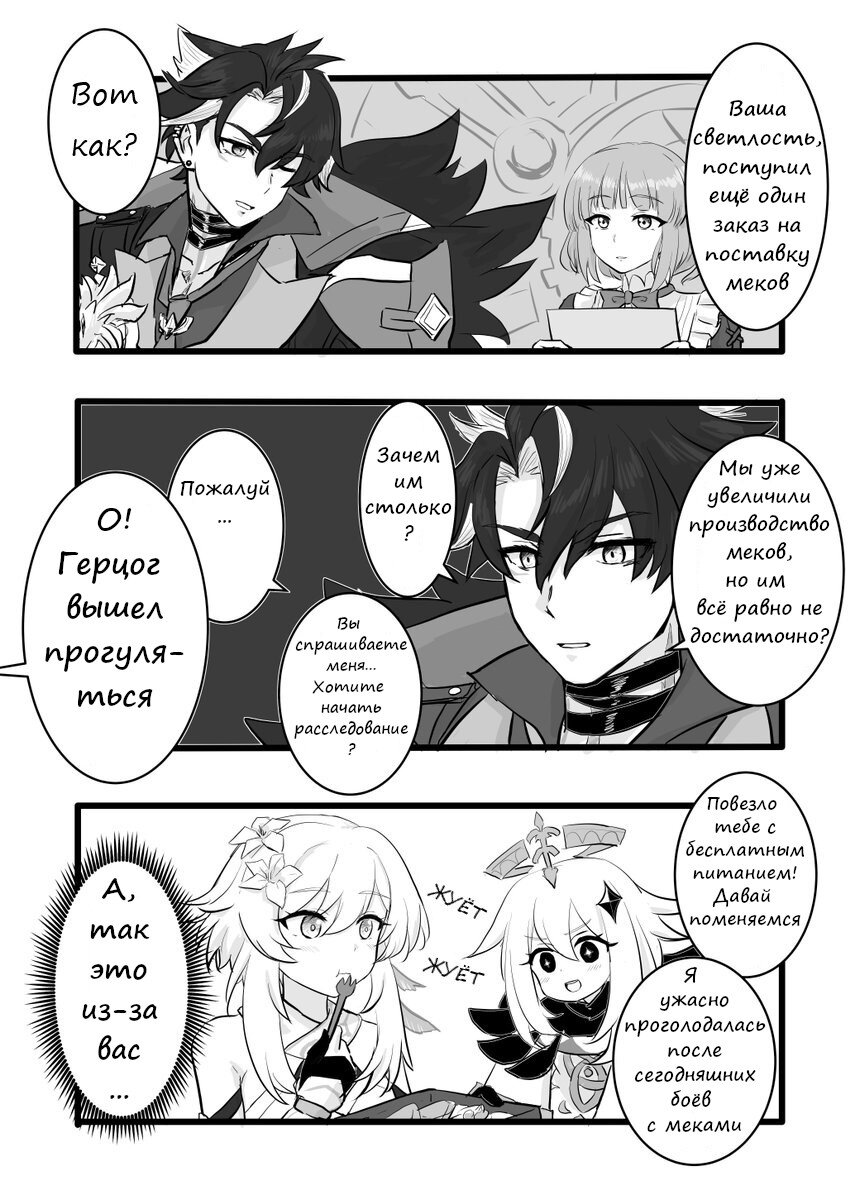 Ста лет не прошло (всего-то полгода) со времён последней подборки комиксов про Геншин, а у меня уже готова новая! Ещё в декабре прошлого года мне пришла в голову мысль перевести несколько комиксов с японского - зря я что ли учу его?. Но потом я увлеклась итогами года, потом у меня был отпуск, потом я занималась ещё какой-то ерундой, и в итоге до перевода добралась только сейчас. Поскольку они японские, а отзеркаливание манги я считаю ересью, комиксы в подборке читаются справа налево. Японские комиксы - непаханое поле для переводчиков. Их рисуют очень много, а переводят очень мало. В прошлых подборках, переводов с английского, я старалась не трогать комиксы, которые уже были переведены и опубликованы в ру-сегменте, но с японскими можно не ставить себе таких ограничений - большинство из них не дошли даже до англоязычных переводчиков. Поэтому оригиналы я выбирала методом тыка. И поэтому некоторые из них оказались довольно старыми, посвящёнными давно уже прошедшим игровым событиям. Напри