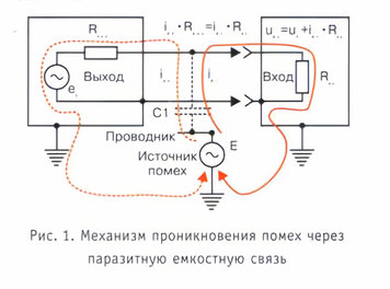 Если около электрической соединительной линии окажется провод, на котором присутствует напряжение "Е" (естественно, переменное), то оно через межпроводную емкость "С1" попадет в сигнальную цепь.