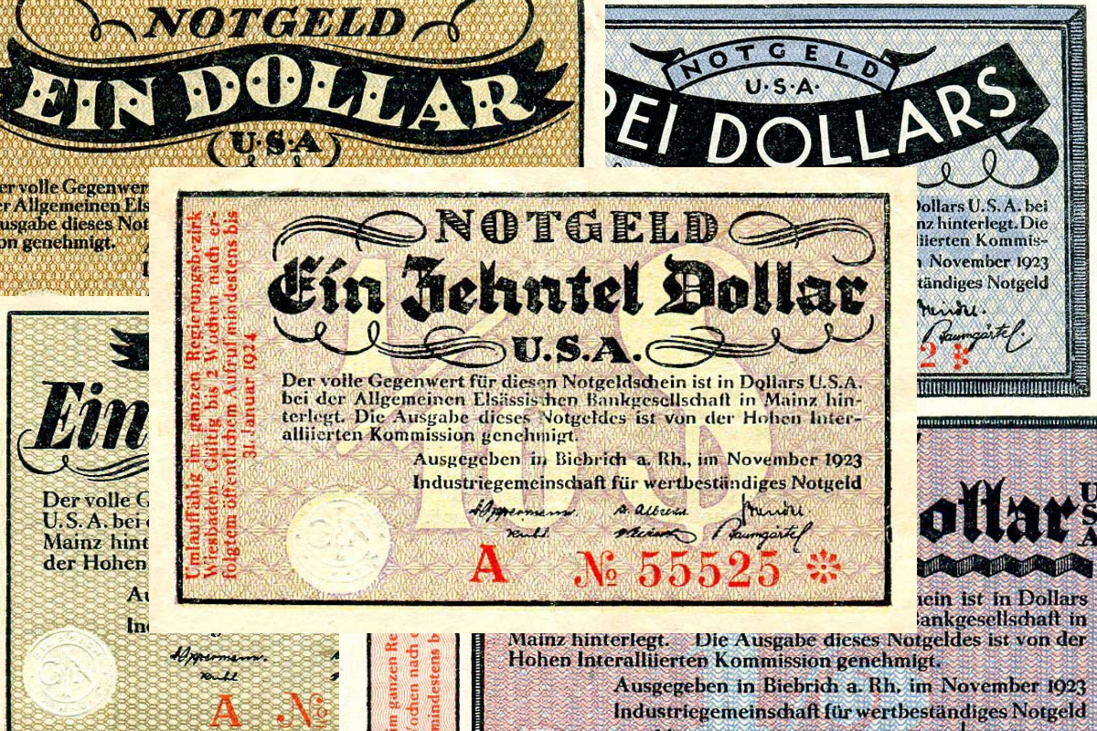 На некоторых промышленных предприятиях из-за инфляции в 1923 году были попытки объединить общины для создания стабильных по стоимости чрезвычайных денег, чтобы обеспечить стабильную стоимость при выплате заработной платы. Таким образом, семь промышленных предприятий в Бибрихе образовали с этой целью "Промышленное сообщество для стабильных по стоимости чрезвычайных денег". В Бибрихе на Рейне (провинция Гессен-Нассау) в октябре 1923 года было создано "промышленное сообщество для стабильных по стоимости чрезвычайных денег", руководство которого находилась в руках компании Kalle & Co. В начале ноября сообщество с разрешения I.A.R.K. (Высшей межсоюзнической комиссии) выпустило чрезвычайные денежные средства в размере 1/10, ¼, ½, 1 и 3 доллара, которые ранее должны были быть покрыты иностранной валютой в Общей Эльзасской банковской компании в Майнце. Этому банковскому учреждению также было поручено хранение стоимости покрытия при выпуске чрезвычайных денежных средств в золотых марках для ряд