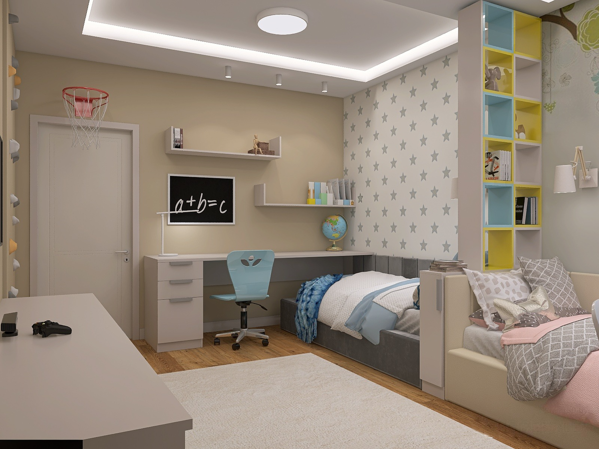 Допустим, у вас уже есть хороший ремонт, но вам нужно создать общую детскую комнату для детей разного пола. Вы не знаете, как разделить пространство на зоны: предусмотреть рабочее место для дочки-школьницы и игровую зону для сына-дошкольника, чтобы они не мешали друг другу и вписывались в стиль всей квартиры?