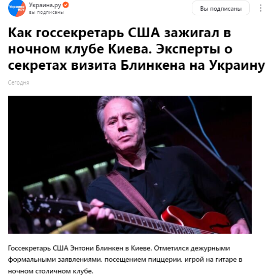 Лучше б он играл на гитаре или пел в церковном хоре, Политика ремесло не для слабых, если с Россией находишься в соре. Это новый тренд. Американское ноу-хау в дипломатии. Если ничего не получается в турне по странам и миссия провалилась. Она оказалось не подъёмной глыбой. Если, убедить, прежде всего, американских избирателей, что Америка всё ещё «владыка мира», не получилось, то следует прибыть на Украину и устроить рок концерт. Что говорить, раз не чего говорить? Печаль и разочарование. Тотальная коррупция и казнокрадство. Киевский режим пробил очередное дно. Выделенная американская помощь на возведение «неприступной фортеции» в Харьковской области в очередной раз банально разворована. Путинские войска двигаются ударными темпами на Харьков. Есть мнение, что причиной незапланированного визита Блинкена в Киев стали успехи российских войск на Харьковском направлении, которые "прозевала" хвалёная НАТОвская разведка. Скорее всего, с этой целью и приехал Блинкен — рассказать главе Киевског
