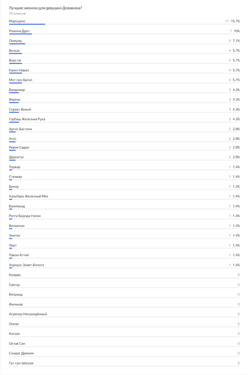 Все "ванильные" женихи Скайрима перечислены ЗДЕСЬ: ОПРОС - выборы лучших и худших кандидатов в мужья Довакинши - ЗДЕСЬ: На сегодняшний день по результатам опроса рейтинг женихов такой: ЛУЧШИЕ ЖЕНИХИ: 1-е место - Маркурио 2-е место - Ромлин Дрет 3-е место - Онмунд Остальные кандидаты набрали меньше голосов: "ХУДШИЕ" ЖЕНИХИ: 1-е место - Октав Сан 2-е место поделили между собой два кандидата: Белранд и Агренор Награждённый 3-е место сразу у трёх кандидатов: Филньяр, Рогги Борода Узлом, Гат гро-Шаграк Не вошедшие в тройку лидеров разделили между собой остальные места: Интересно, что трое лидеров из топа лучших женихов находится в середине списка в рейтинге худших. Те, кто пропустил публикации о невестах Довакина, можете перейти по ссылкам ниже, рассмотреть "ванильных" девиц на выданье, поучаствовать в опросе - и - кто знает? - быть может, Ваше мнение изменит ТОП невест: