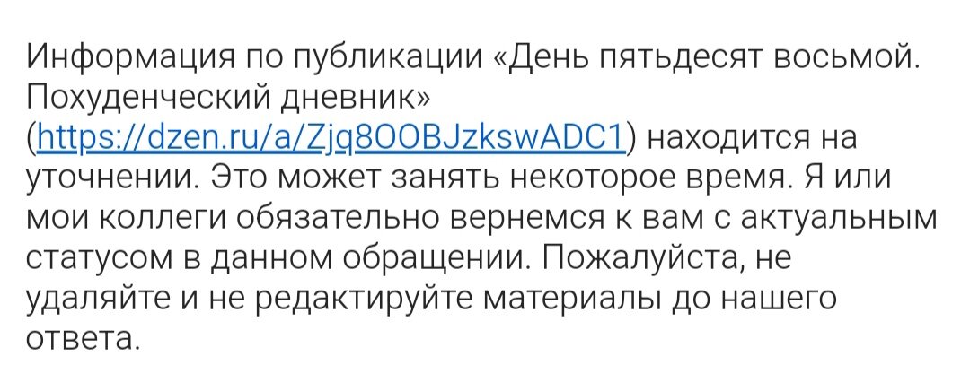 Я как-то совсем перестала следить за статистикой, и после подключения монетизации ни разу туда не заглянула, а несколько дней назад провалилась в эту вкладку, прошлась по своим опубликованным заметкам и напротив этой статьи увидела нолик на времени просмотра. Это было непонятно и неожиданно... Что такого было в моем дневнике похудения, что его заблокировали? Конечно, я обратилась в поддержку с данным вопросом и буквально через двадцать минут пришёл вот такой ответ На следующий день новый ответ Далее следовал текст из моей публикации о свойствах имбиря и кефира, понятно, что сейчас я не могу их здесь написать,