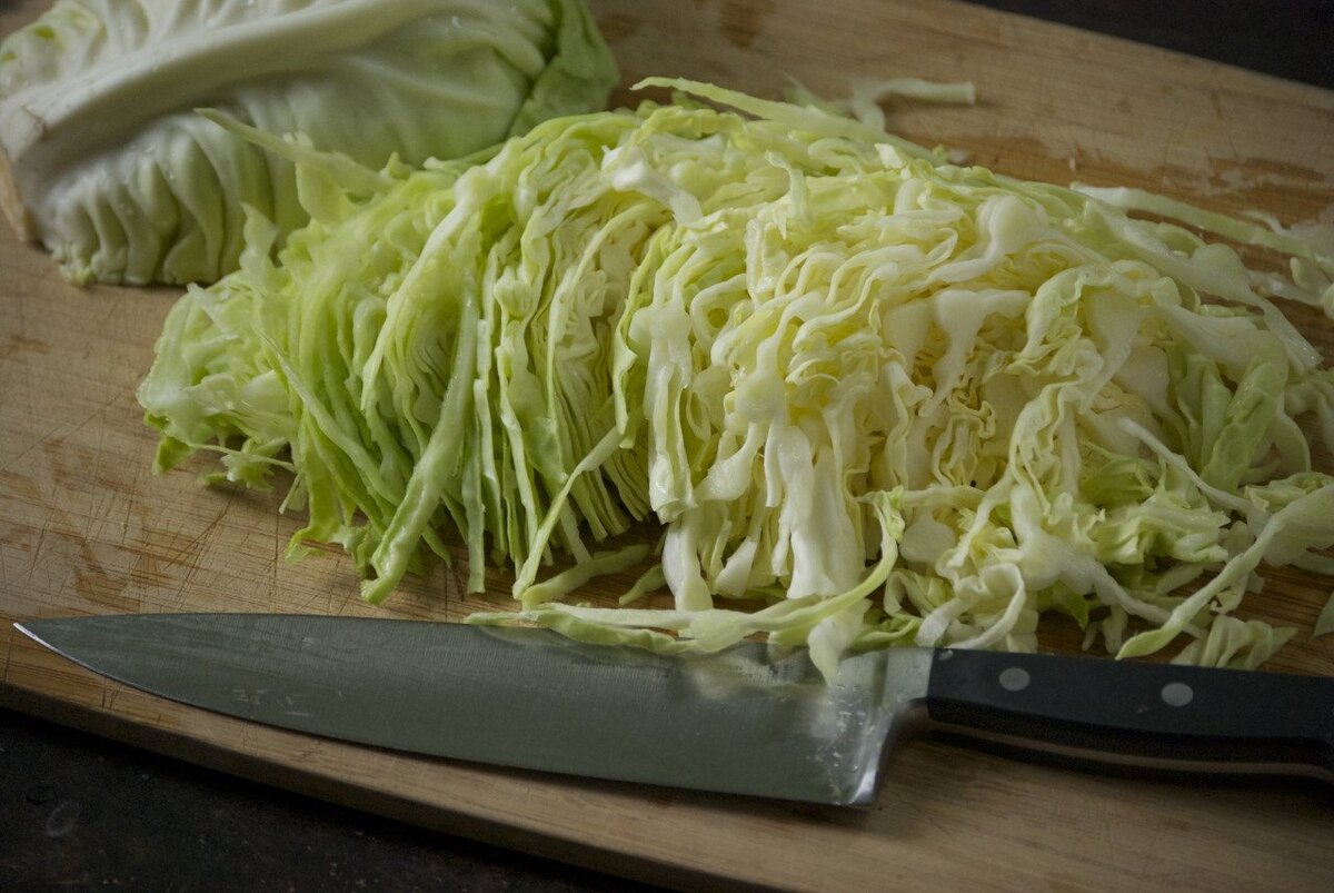 Капусту нужно мелко нашинковать, подсолить, после чего промять руками, чтобы пустила сок. Добавить к салату масло и соевый соус, присыпать любимыми специями.