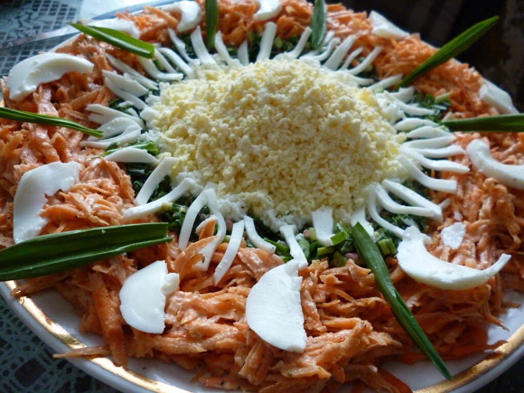 Ингредиенты: морковь-5-6 шт; черемша-1 пучок; яйцо-6 шт;корица-1/2 чайной ложки;соль, специи- по вкусу; уксус 6%-1 столовая ложка;майонез. Морковь почистить и нашинковать на крупной терке, добавить соль, корицу, специи, майонез, уксус. Все перемешать и выложить кольцом на большое блюдо. Черемшу почистить,порезать. посолить, потолочь или помять руками, добавить майонез и выложить поверх моркови. Яйца отварить, остудить, отделить белки от желтков, отдельно нашинковать белки и желтки на мелкой терке. Поверх черемши выложить белки, на белки горкой желтки. Оформить яйцом и зеленью черемши по своему вкусу. Перед употреблением перемешать. Приятного аппетита! Ингредиенты : морковь- 5-6 шт; черемша- 1 пучок; яйцо- 6 шт;корица- 1/2 чайной ложки;соль, специи- по вкусу; уксус 6%-1 столовая ложка;майонез. Морковь почистить и нашинковать на крупной терке, добавить соль, корицу, специи, майонез, уксус. Все перемешать и выложить кольцом на