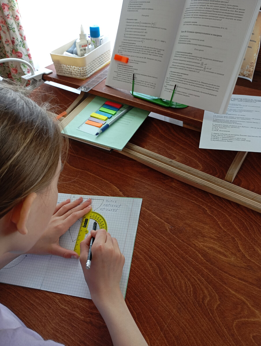 Утро субботы, а наши дети вовсю учатся а нашей семейной школе. У пятиклассницы сейчас идёт урок геометрии. Мы не изучаем ее в математике, мы разделили математику на арифметику и геометрию, и учим эти дисциплины по отдельности. Считаю, материал лучше воспринимается, когда он четко структурирован. Второклассница же занимается рисованием - рисует на сдачу аттестации рисунки: Дворец теплого солнца и Зимний лес из раздела: что может линия. До этого с ней же еще делали аппликации по технологии.