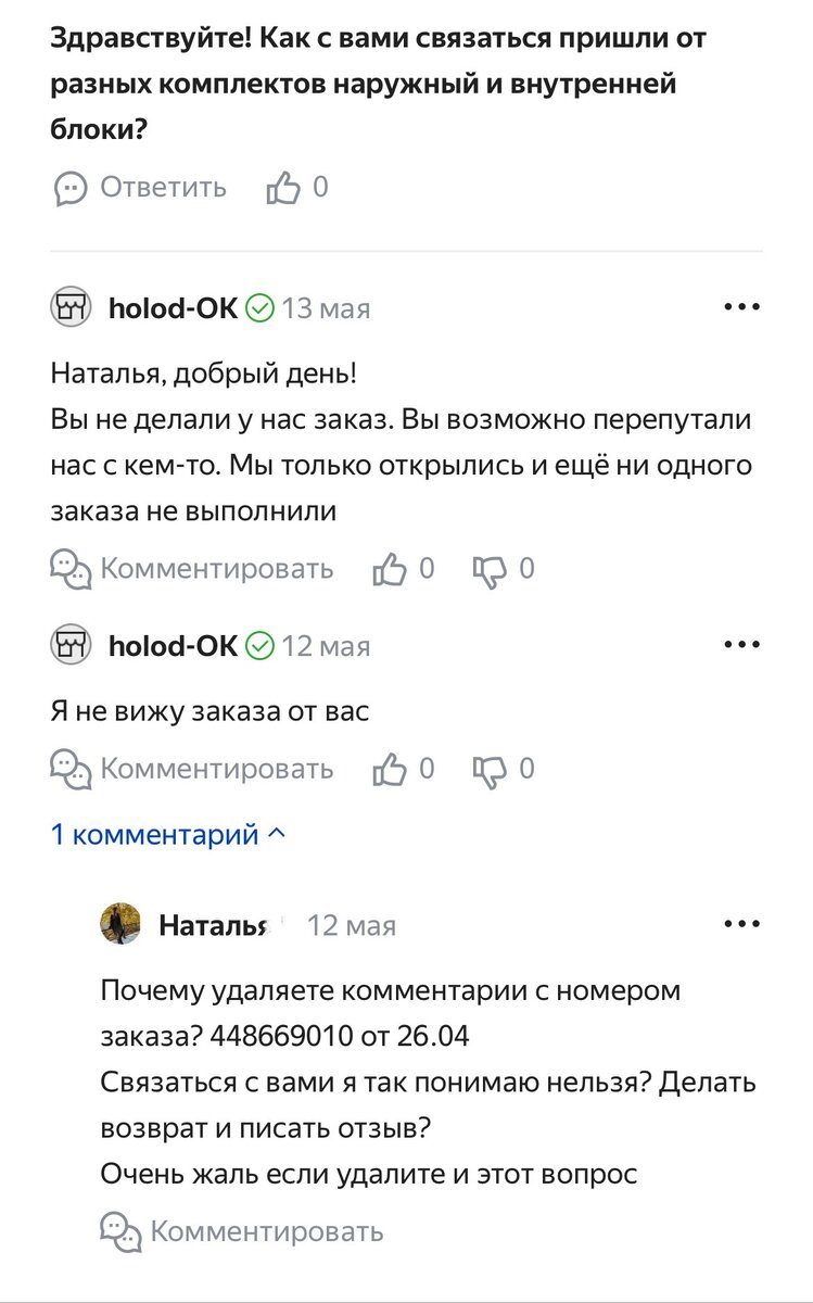 Добрый день! Сегодня продолжение истории про покупку кондиционера. Купили мы его на Яндекс маркете и нам не повезло - привезли не тот наружный блок, который не будет работать с внутренним. Прошло уже много времени, а проблема так и не решилась. Сначала я связалась с маркетом с вопросом о возможности обмена только наружного блока. Яндекс передал мои данные продавцу и мы созвонились, где человек сказал возвращайте, но как не объяснил, и согласился со мной, что да через Яндекс. Яндекс же просто маркет, а не курьерская служба поэтому снова отправили меня продавцу, с которым я уже не могла связаться напрямую: Итог ответ от продавца - «Вы у нас ничего не покупали!» Предистория - номер заказа я писала несколько раз и он исчезал, я грешила на сайт и написала новый вопрос, сразу с номером заказа и он исчез и появился комментарий, что не видим вашего вопроса. Яндекс маркет же со своей стороны, звонили несколько раз мне, писала и на почту решился ли вопрос. И пытались связаться с продавцом