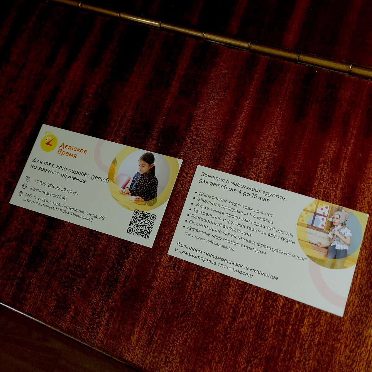 Есть два мнения по поводу дизайна визиток. Первое — визитка должна быть минималистичной. Лого, телефон, сайт или QR. Второе — в визитку надо разместить УТП с сайта: сколько лет компания на рынке, с какими партнёрами мы работаем и т.д. Верны ли эти подходы? Ситуативно. Всё всегда зависит от ЦА. Покажу на примере недавно созданных визиток для детского центра. Их целевая аудитория — родители, дети которых учатся на заочном обучении, и родители, ищущие репетиторов или частные школы. Они уже приняли решения, что будут обучать ребёнка дома, и им нужны сильные помощники. Что мы должны сказать родителям, если у нас есть только визитная карточка? 1. Название. Как, правило, это лого. 2. Для кого наши услуги? Для их детей, если они не ходят в муниципальную школу. Детских центров огромное количество, а мы работаем с теми, кто обучается на дому. Более того, у нас есть ограничение по возрасту. Вписываем это, чтобы сразу же отсечь нецелевые лиды. 3. Что конкретно входит в наши услуги? Перечисляем за