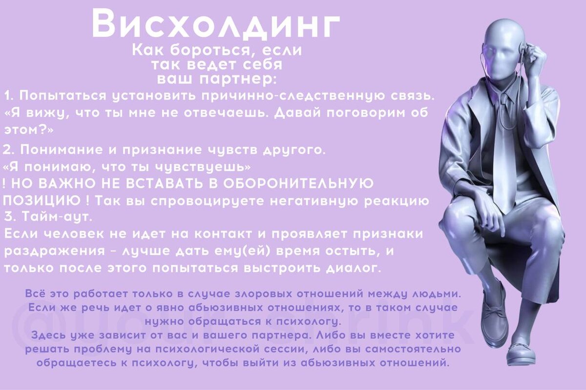 Висхолдинг (от англ. withholding – умалчивание) является ещё одним видом эмоционального насилия и может быть охарактеризован как "наказание" молчанием. Приведу пример. Представьте: вы приходите домой, а ваш партнер игнорирует вас без объяснения причин. Как бы вы ни старались – в ответ вы получаете молчание. Вы начинаете строить догадки, что вы сделали не так и чем могли обидеть. Вместо того, чтобы обсудить конфликтную ситуацию и разрешить её, партнер просто замыкается и игнорирует. Это и есть висхолдинг. Прежде чем винить человека в висхолдинге, давайте подумаем, что он может чувствовать в этот момент? Человек испытывает одиночество, дискомфорт, негативные эмоции, и поэтому выбирает стратегию избегания: ведь избежать травмирующую ситуацию = избежать душевную боль. Но есть и другая сторона – желание наказать. С помощью этого, соотвественно, вызвать у вас чувство вины и стыд. Висхолдинг встречается как между партнерами, так и в отношениях с семьей, коллегами и друзьями. Так как типы