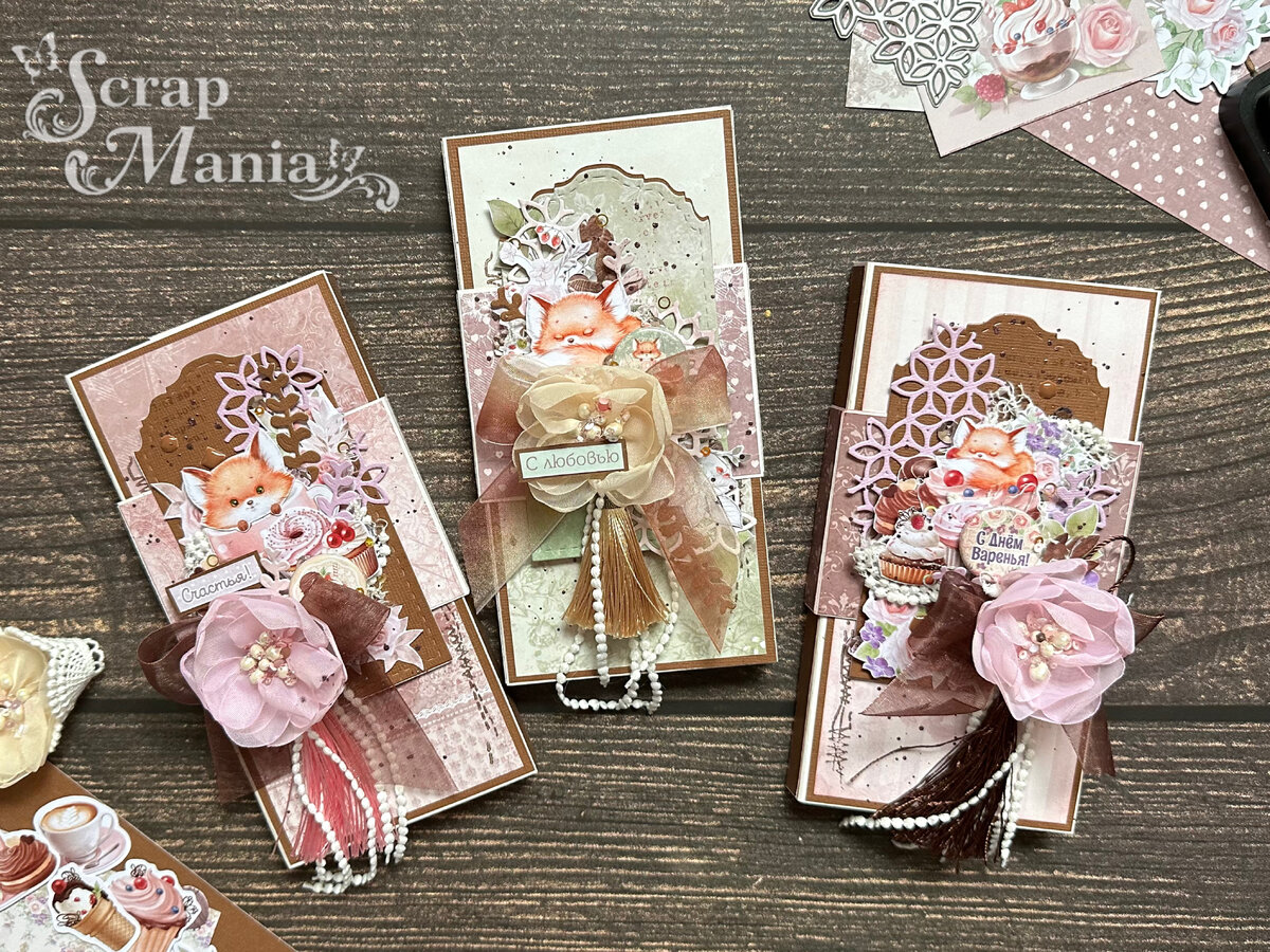 Привет всем! Я, Елена Ларионова, хочу представить вашему вниманию очаровательные, милые и очень сладенькие ... шоколадницы! А как еще можно описать все, что получается из этой коллекции - "Карамельное лето"? На ум приходят только самые милые и сладкие слова. А все из-за главного героя - лисенка, который уютно свернулся на аппетитных десертах или выглядывает из чашки! Я уже не говорю про эти сладкие угощения, которые хочется попробовать, и про нежные, "вкусные" кремово-шоколадные оттенки принтов бумаги! Вот поэтому я сразу решила сделать три шоколадницы, ведь в них можно положить вкусный шоколад и подарить кому-то милому, очаровательному и самому любимому! У каждой коробочки есть поясочек, где на тэге и расположился основной декор: Давайте рассмотрим каждую из них поближе. Начнем с шоколадницы "Счастья!" с основой светло-шоколадного оттенка. Главный герой здесь - лисенок, выглядывающий из чашки. Он окружен вкусняшками, фишкой с умопомрачительным десертом, вырубкой-веточками, цветам