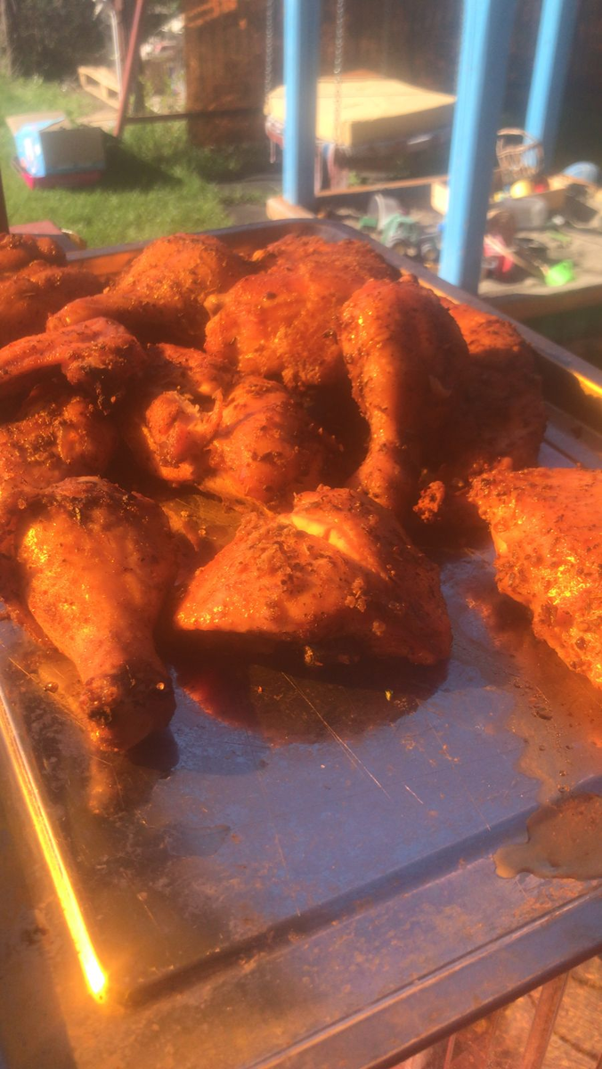 Вспомнила сегодня про коптильню. Давно ничего не коптила, поэтому смоталась в магазин, взяла три курицы, разделала их. сделала три разных варианта посола и включила коптильню. У меня все любят достаточно пикантную засолку,поэтому там одновременно и черный перец и красный перец и паприка и имбирь и прованские травы могут присутствовать. Главное, чтобы приятно кушать было. Коптильня у нас самодельная, одновременно вмещается 12 курей, три полки, поэтому обычно я с таким маленьким количеством не заморачиваюсь. Но сегодня так получилось. К моменту фото готовой курицы часть уже была опробована и роздана. Сын приезжал, яму под слив выкапывал почти двухметровую. Немного недокопал, вечная мерзлота,понимаете ли. Сейчас немного согреется и муж доделает. Просто мне возле коптилки муж обещал сделать зону готовки с доступом к воде, чтобы из дома не таскать туда-сюда. А еще сегодня доски купили для сарая нового. Так что мужу фpoнт работ обеспечен, скучать некогда будет. А я еще окрошки накрошила, де