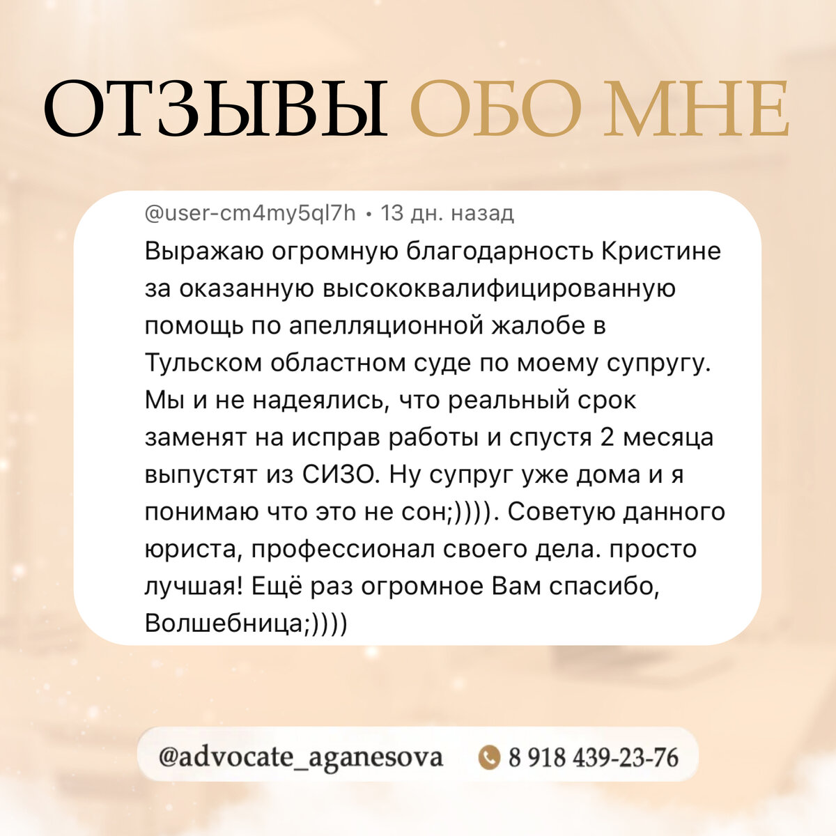 Мой подзащитный был осужден на 7 лет по ч.3 ст.З0, п.«г» ч.4 ст.228.1 УК РФ за незаконный сбыт и распространение наркотиков. Судом были учтены смягчающие обстоятельства, исключен сбыт с использованием интернета и исключены отягчающие обстоятельства. В итоге срок был снижен на 1,5 года благодаря моей тщательной подготовке к делу и грамотным обоснованиям. Об этом деле я публиковала видео из суда, обязательно посмотрите его Спасибо за доверие и веру в меня!🙌🏻 —————— 🤝🏻 Если вам нужна консультация, юридическая помощь или защита в суде, обращайтесь по контактам ниже 📲 +7 918 439-23-76 (ВотсАп / Телеграм) Написать мне в ВК: https://vk.com/im?media=&sel=-221572239 Написать мне в Телеграм: https://t.me/aganesova_advocate Написать мне в WhatsApp: https://wa.me/79184392376 Группа в ВКонтакте: https://vk.com/advocate_aganesova Канал на YouTube: https://www.youtube.com/@advocate_aganesova Канал в Телеграм: https://t.me/advocate_aganesova
