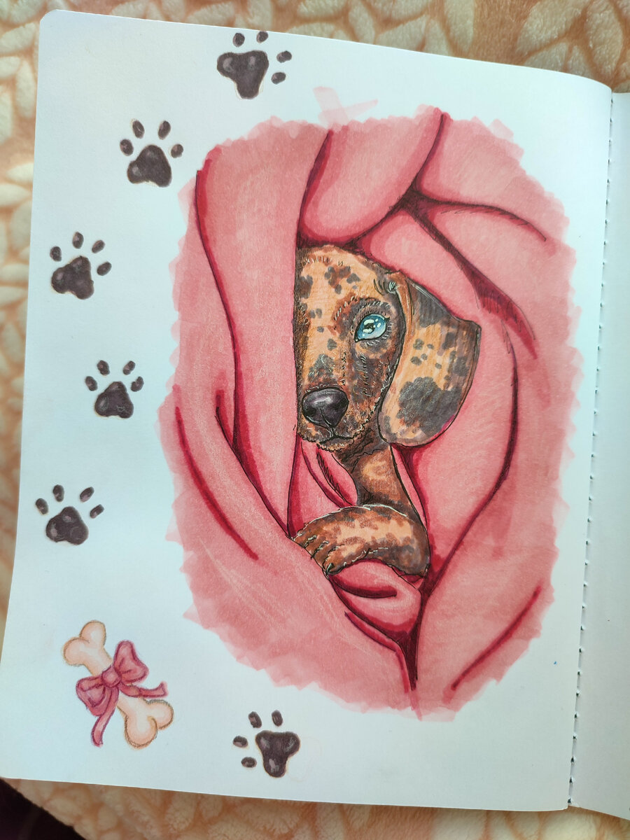 Но при чем тут щенок таксы, спросите вы?) А при том, что это мой недавний неудачный рисунок. В карандаше он был ужасен и мне хотелось просто все стереть и забыть. Но я заставила себя продолжить. Ну будет у меня в скетчбуке страшный щенок, что такого? И на этапе цвета все как-то более менее выправилось, и щенок получился вроде даже миленьким)