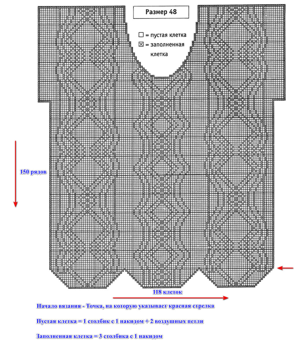 В журнале нашла схему футболки для филейного вязания крючком. Правда в журнале она вязалась очень тонкой пряжей и тонким крючком. Смотрится изделие тонко и ажурно. Но если взять пряжу и крючок потолще, то готовое изделие не только изменится внешне, но и здорово увеличится в размере. Это важно учитывать. Для вязания данной футболки понадобится: Начало вязания футболки крючком: Провязываем 357 воздушных петель, в 4 воздушную петлю начинаем вязать по схеме. Схема футболки крючком филейное вязание: В результате связанное изделие сморится очень нежно и ажурно: Вдохновения в работе!