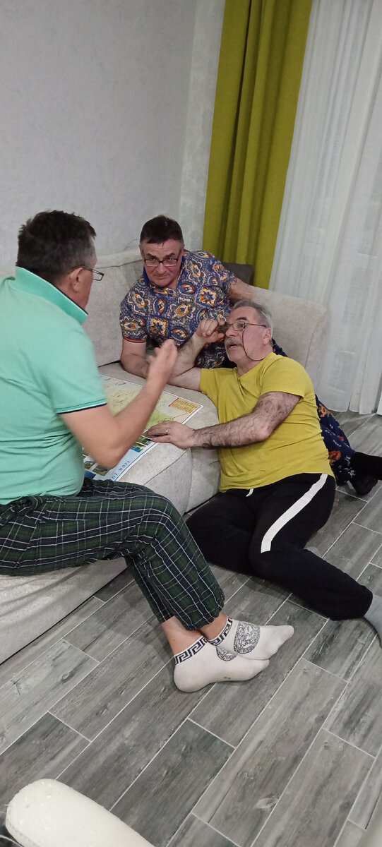 Ничего не предвещало этой встречи, всё произошло неожиданно, как гром среди ясного неба. Восемь часов вечера. Звонок, Валера взял трубку. Я поняла, что он разговаривает с другом. Время в Сибири час ночи. Уже можно поздравить его. Валера говорит:"Он вместе с Лёней, и кажется они сейчас приедут." Я отвечаю:"Да ну, не может быть." Тут же звонок мне, беру трубку, звонит Боря. Я включаю громкую связь и кричу:"Боречка с днём рождения!!! У вас уже ночь, и тебя можно поздравить." Связь прерывается. Снова звонок. И тут Валера с улицы кричит:"Наташа, они точно едут. Сейчас уже мимо школы проезжают. Я с водителем такси разговаривал." Через пару минут подъезжает такси и выходят наши друзья. Шок от неожиданности, счастья и восторга одновременно. Слёзы, поцелуи и обнимашки. Валера очень, очень обрадовался. Быстро собираем на стол, ребята уставшие, но довольные нашей реакцией на их сюрприз. Потом были долгие разговоры, расспросы, воспоминания. Ребята прилетели на неделю. Много это или мало. Конечно