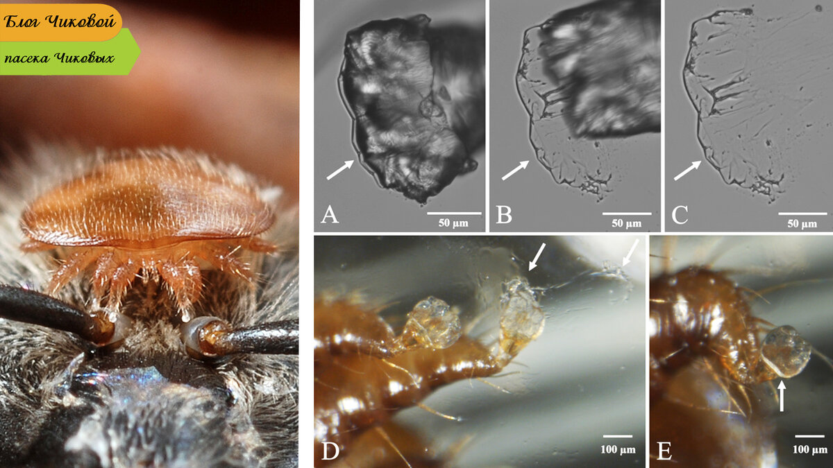 Есть ли у клеща Варроа присоски на лапках? Что касается аролии Варроа, то подушечки на его лапках не предназначены для присасывания. Учитывая их форму и движение, они скорее всего предназначены для передвижения и хватания. Насколько я понимаю, клещ не присасывается, а прилипает к поверхности, благодаря жидкости, которая выделяется на поверхности подушечки. Эта жидкость (секреция) и помогает ему удерживаться на любой поверхности и под любым углом.