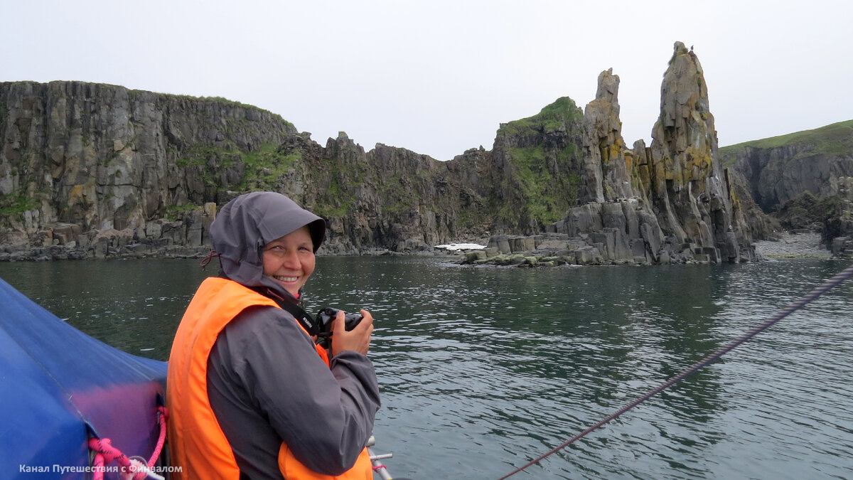 С приливом мы снялись с «постамента» и в тумане прошли вдоль живописнейших скал мыса Столбовой. Учет каланов при такой видимости был тоже проблематичен.