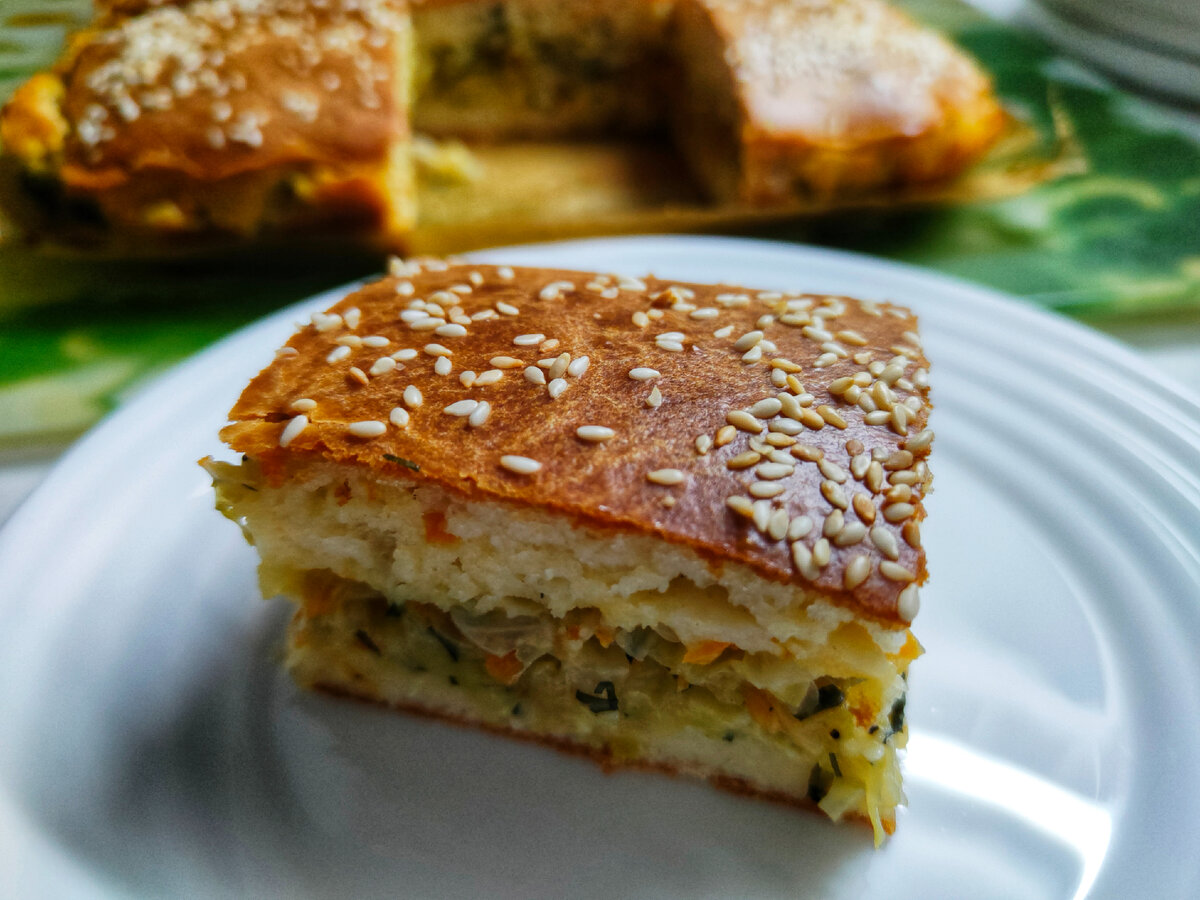 Этот аппетитный пирог с капустой приготовить совсем несложно, ведь тесто замешивается просто венчиком. Ничего месить и раскатывать не придётся. Тем не менее, это настоящий пирог, а не запеканка: тонкий слой пышного теста, много вкусной сочной начинки 🤗 Тесто: - яйца С1 3 шт. - сахар 1 ч.ложка - соль 1/2 ч.ложки - кефир 250 гр. - масло рафинированное 80 гр. - мука в/с 250 гр. - разрыхлитель 1 пак. 12 гр. Начинка: - капуста 400 гр. (чистый вес) - морковь 1 шт. небольшая - лук 1 шт. небольшая - укроп 2 ст.ложки нарезанного - масло сливочное 30 гр. - масло растительное 20 гр. - соль 1/2 ч.ложки - семена кунжута (по желанию) Сразу же достаём из холодильника все продукты для теста, чтобы они согрелись до комнатной температуры🌡️ Измельчаем лук и морковь. Обжариваем на смеси сливочного и растительного масла: Добавляем мелко нашинкованную капусту, соль и молотый перец. Перемешиваем. Огонь убавляем до среднего и тушим под крышкой минут 12-15 (до мягкости). Периодически открываем кр