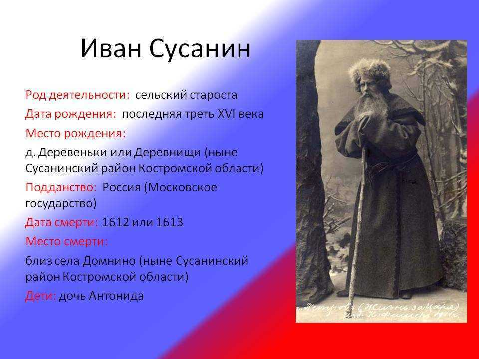 В 1613 году польско-литовский отряд ворвался в окрестности Костромы, чтобы найти и убить новоизбранного русского царя Михаила Федоровича Романова. Однако нашли они только деревенского старосту Ивана Сусанина, который специально завел врагов в глухое место. И хотя Сусанин знал, где прячется царь, даже под пытками поляков он до конца хранил молчание.