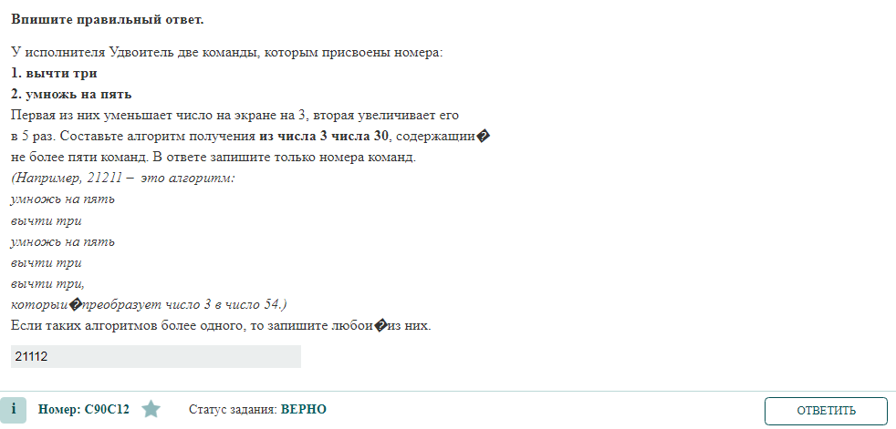 не более пяти команд. В ответе запишите только номера команд. (Например, 21211 – это алгоритм: умножь на пять вычти три умножь на пять вычти три вычти три, который преобразует число 3 в число 54.) Если таких алгоритмов более одного, то запишите любой из них. РЕШЕНИЕ Будем идти от числа 30 к числу 3 применяя противоположные команды, так мы будем видеть когда промежуточный результат можно без остатка поделить на 5. Тогда мы имеем команды: 1. Прибавь 3 2. Раздели на 5 1) 30 можно без остатка поделить на 5: 30/5=6 Команда 2 2) 6 нельзя без остатка поделить на 5, прибавим: 6 + 3 = 9 Команда 1 3) 9 нельзя без остатка поделить на 5, прибавим: 9 + 3 = 12 Команда 1 4) 12 нельзя без остатка поделить на 5, прибавим: 12 + 3 =15 Команда 1 5) 15 можно без остатка подели