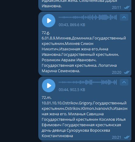Наконец, я начала воплощать свою идею об использовании аудиосообщений в индексации. Первым делом, я опробовала эту функцию на разборе семей из Ревизских сказок, но без перспективы отправить эти тексты в справочники. Пока. А вот к метрическим книгам подход уже более серьезный: без индексации разобрать все родственные связи оказалось нереально. Шаг первый: определиться с форматом таблиц Для начала нужно выбрать категории данных, отображаемых в таблице. Если бы я не собиралась впоследствии формировать из этих таблиц справочники для Familio, то ограничилась бы просто датами и именами. Особенно в топку пошли бы имена всевозможных священников, проводивших таинство, которые постоянно меняли свой состав от ребенка к ребенку. 30% времени уходит на то, чтобы записать эту крестильную команду. Поэтому пока что я их не записываю, а то запал быстро иссякнет. Для того, чтобы текстовый файл можно было открыть как таблицу, необходимо задать символ-разделитель. Аудиосообщения телеграмма и без того за
