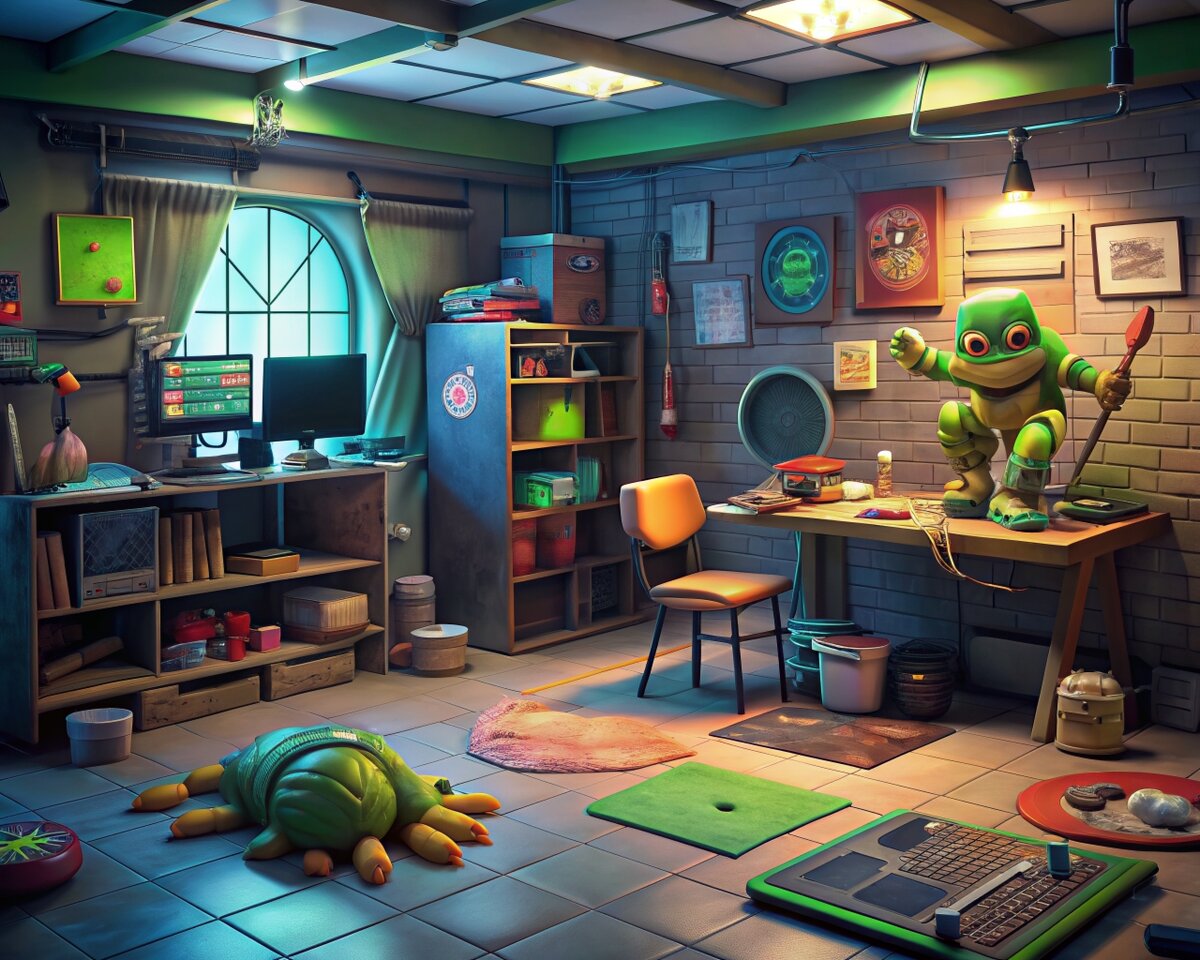 Войдя в комнату, вы заметите, что она оформлена в стиле ниндзя-шик. Стены украшены граффити и фресками со знаковым логотипом Черепашек, а пол покрыт милым клетчатым узором. Вы также увидите несколько их любимых закусок, таких как коробки с пиццей и рожки с мороженым.