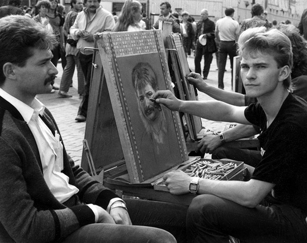 ― Не берите в голову... Вот, готово! ― портретист поднялся с деревянной табуретки, снял лист с мольберта и вручил ребенку. Тот, довольный, побежал к родителям. ― А вот теперь я весь внимание. Кого пишем?