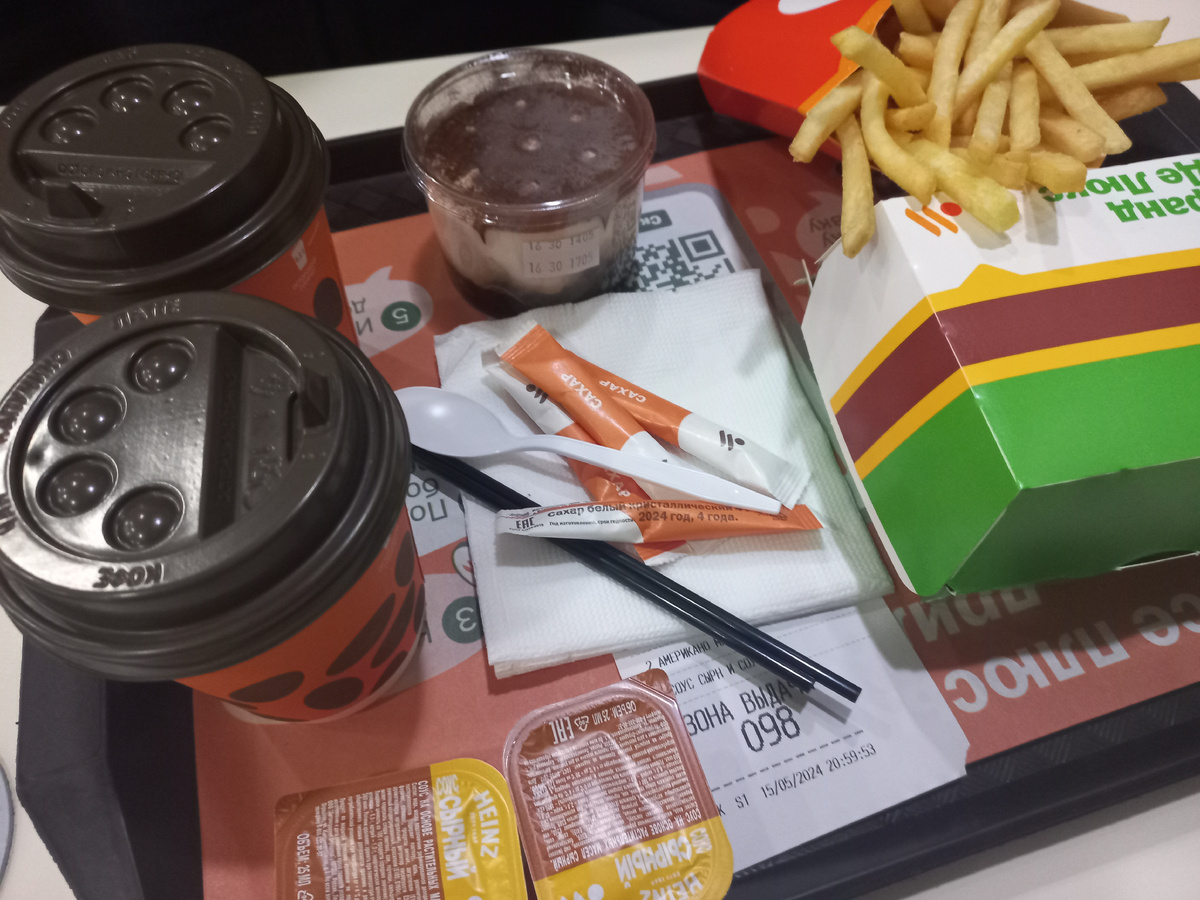 Обычно мы берём по бургеру, картошку фри и напитки: я заказываю кофе, а дети сок.