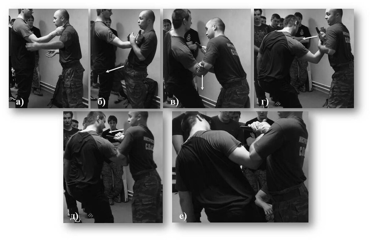 Удар в горло рукой для отвлечения рис. а) и сразу переход на удар в локтевой изгиб рис. б) вооруженной руки для того, чтобы согнуть руку рис. в) и перейти к выполнению правила «С» рис. г), д). Давление в сторону большого пальца рис.е) дает возможность забрать нож из руки рис. ж) и рис. з).
