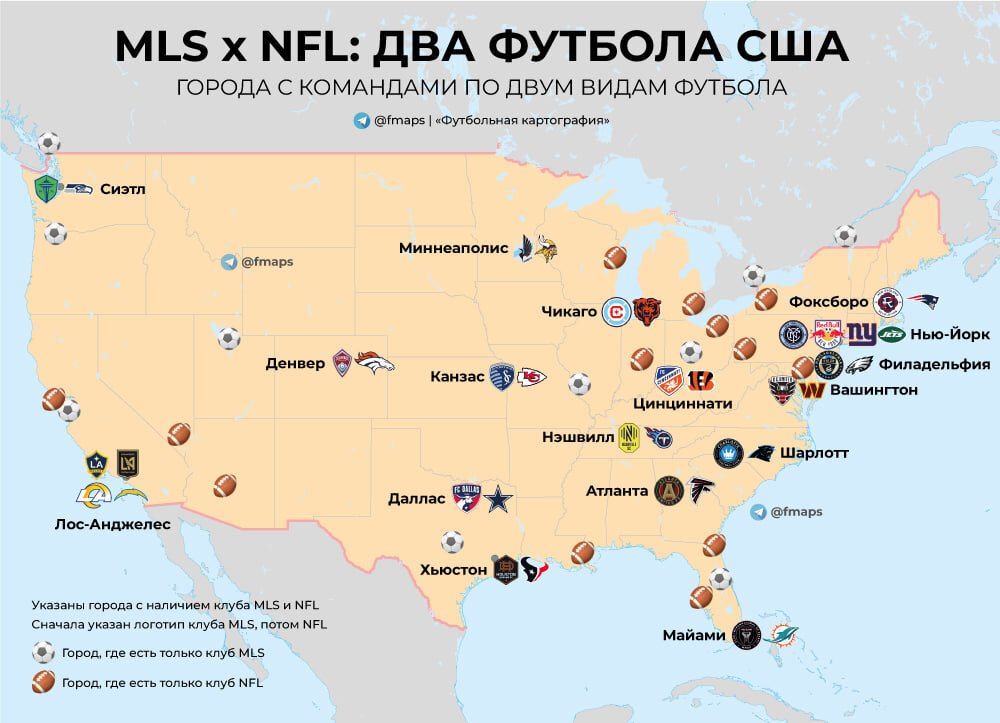 Как известно, на североамериканском континенте словом «футбол» называют совсем не ту игру, которую знаем мы. Традиционный американский футбол: с «дыней» вместо круглого мяча, с возможностью бежать с этим атрибутом в руках, а очки дают за удары выше перекладины. Эту и другие интересные карты и инфографику о футболе вы можете увидеть в Телеграм-канале «Футбольная картография». Подписывайтесь, чтобы не пропустить обновлений! В NFL (National Football League) 32 команды разделены на 2 конференции и 4 дивизиона, представляют 30 городов. В MLS (Major League Soccer), лиге «соккера», который называем футболом мы, играют 29 команд из 27 городов. Более того, в MLS помимо американских клубов играют также три канадских из Ванкувера, Монреаля и Торонто. Сразу 17 городов имеют команды по двум видам футбола. При этом, сразу в двух из них, гигантах западного и восточного побережья, Лос-Анджелесе и Нью-Йорке, играют сразу по две команды как по амфуту, так и «соккеру». Наибольшую концентрацию команд можн