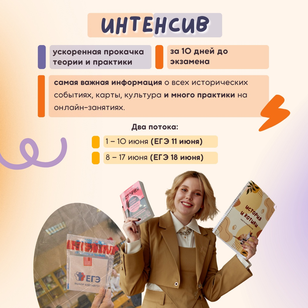 Интенсив можно совмещать с подготовкой в другой онлайн-школе, занятиями с репетитором и, конечно же, это лакомый кусочек для самостояшек. Узнать все подробности и записаться можно на нашем сайте: https://historyandcats.ru/intensiv24/?utm_source=dzen&utm_medium=social&utm_campaign=intensiv2024